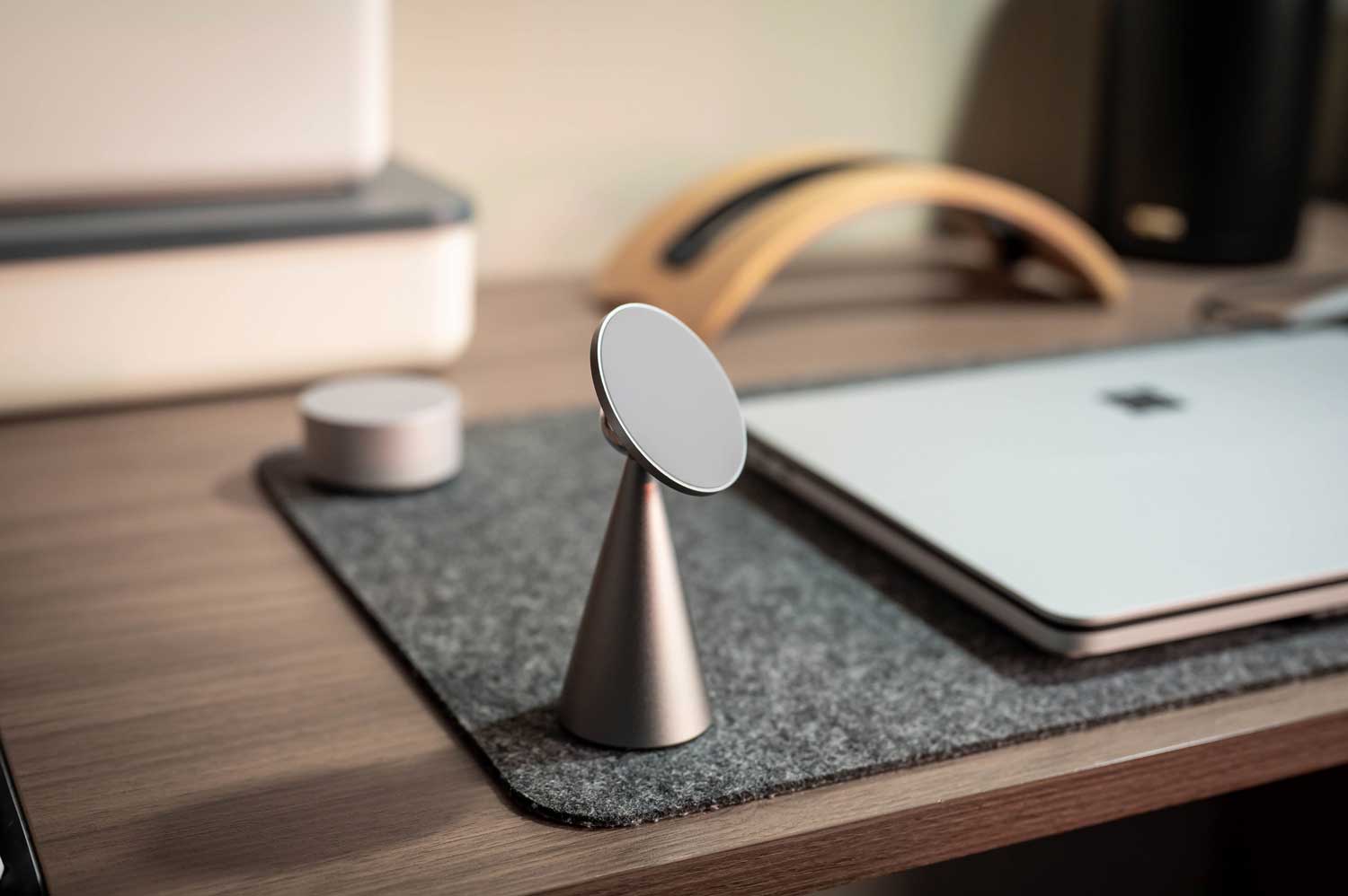 The cone is a basic shape in art. It has the curvaceous beauty of circle and the stability of triangle at the same time. Therefore, we choose cone as the shape of base of the MagHolder. We also installed a ring-shaped rubber pad under the base. It plays the role of anti-skid and table protection.